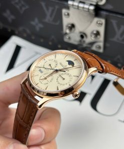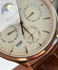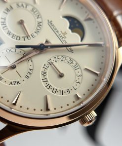 Jaeger-LeCoultre Master Ultra Thin Perpetual là biểu tượng của nghệ thuật chế tác đồng hồ đỉnh cao kết hợp cùng thiết kế thanh lịch vượt thời gian. Sở hữu bộ máy lịch vạn niên (Perpetual Calendar) phức tạp nhưng lại được đặt trong một lớp vỏ siêu mỏng chỉ 9,2mm, chiếc đồng hồ này không chỉ thể hiện kỹ thuật cơ khí tinh xảo mà còn mang đến vẻ đẹp tinh tế đầy trí tuệ. Mặt số bố trí hài hòa với đầy đủ các chỉ báo ngày, tháng, thứ, năm nhuận và lịch tuần trăng, cho thấy sự chú trọng đến từng chi tiết nhỏ nhất của Jaeger-LeCoultre. Với đường kính 39mm vừa vặn, mặt kính sapphire cong và dây da cá sấu cao cấp, mẫu đồng hồ này là lựa chọn hoàn hảo dành cho những quý ông yêu thích sự tinh tế, lịch lãm và giá trị bền vững trong thế giới đồng hồ cơ học cao cấp.